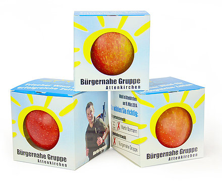 Betellen Sie bitte rechtzeitg. Die Lieferzeit für die Apfelschachtel / Werbeschachtel beträgt ca. 10 Werktage ab Druckfreigabe.